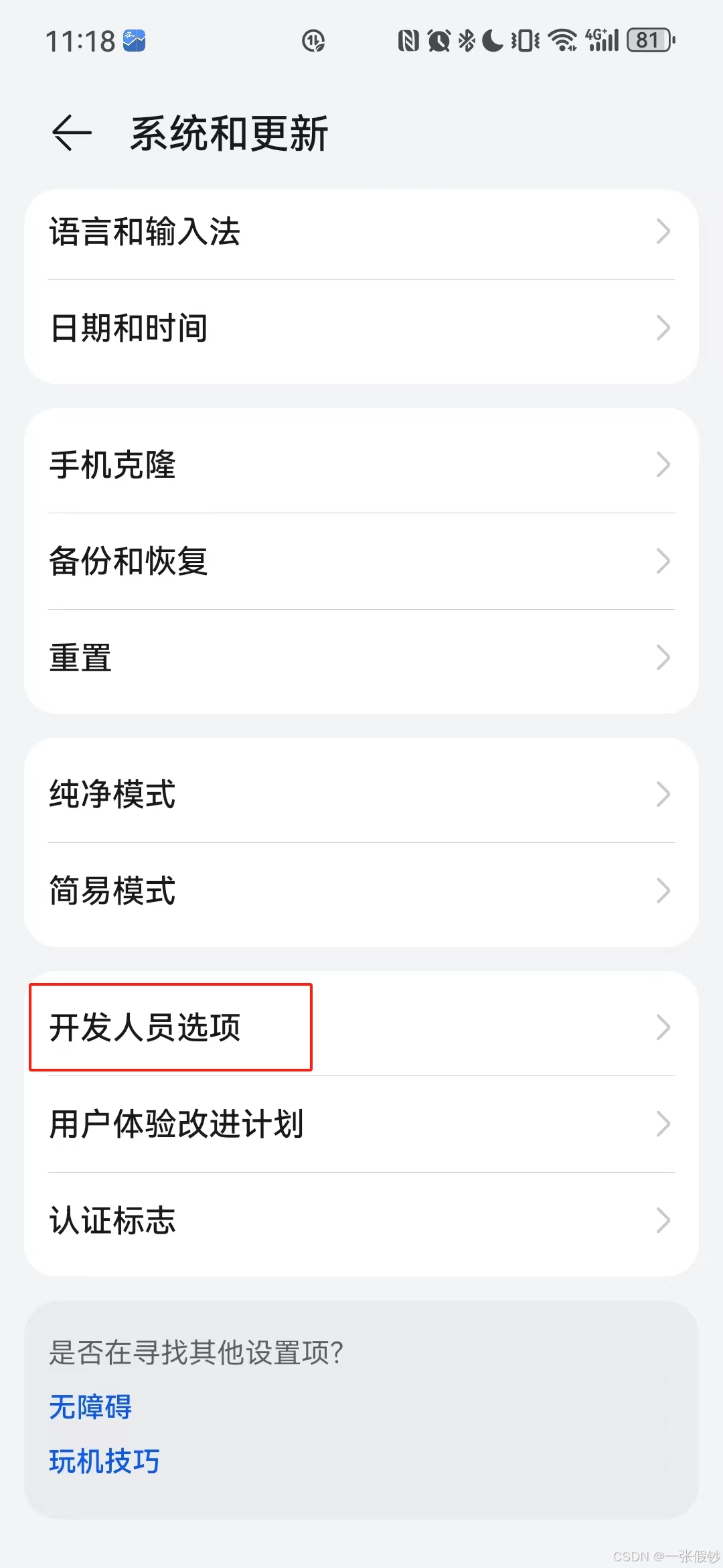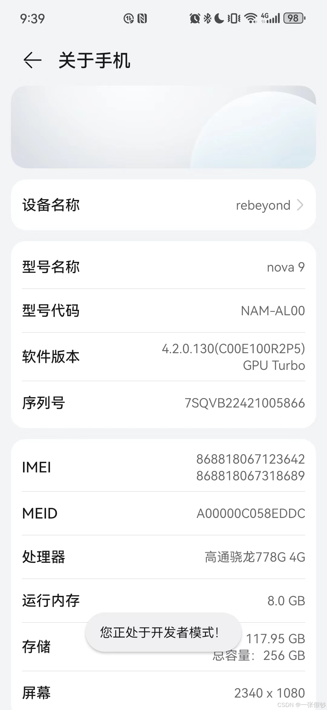 华为Nova9开启开发人员选项 发表于 2025-09-28 分类于 移动端 , Android 阅读次数: Changyan: 默认状态下,华为 Nova9 的开发人员选项是隐藏的,如下图: 要开启开发人员选项,在“设置→关于手机”中找到“HarmonyOS版本”或者“软件版本”,在版本号上连续点击,每次点击“HarmonyOS版本”和“软件版本”会交替出现,大概点7次会出现输入密码界面。输入手机解锁密码,然后就可以开启开发人员选项了。 此时再进入“设置→系统和更新”中,就可以看到开发人员选项了。
