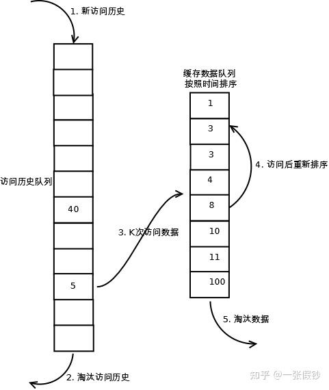 LRU-K 中的 K 代表最近使用的次数,因此 LRU 可以认为是 LRU-1。LRU-K 的主要目的是为了解决 LRU 算法“缓存污染”的问题,其核心思想是将“最近使用过 1 次”的判断标准扩展为“最近使用过 K 次”。