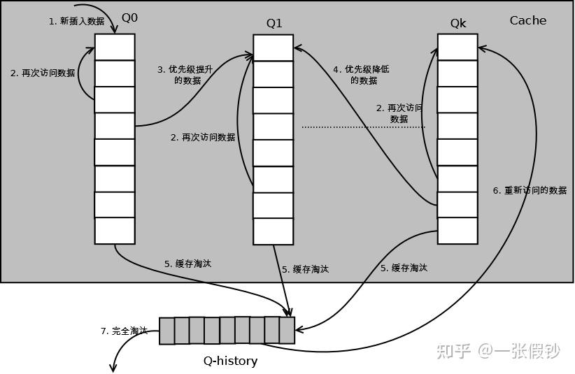 - 需要淘汰数据时,从最低一级队列开始按照 LRU 淘汰;每个队列淘汰数据时,将数据从缓存中删除,将数据索引加入 Q-history 头部;