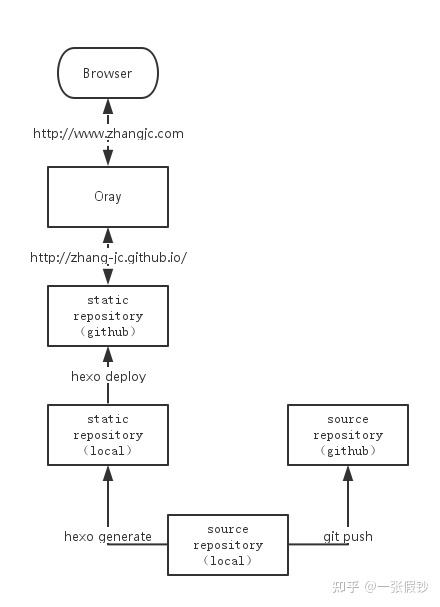 - static repository(local):个人博客在本地生成的静态内容仓库。使用 hexo generate 命令完成。