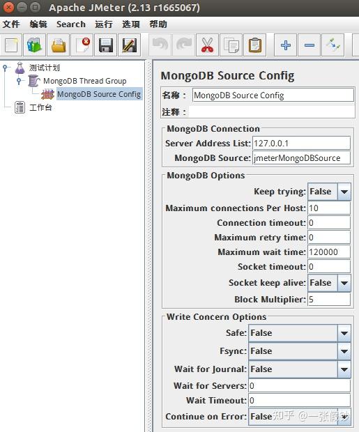 选中刚才添加的 MongoDB Thread Group,点右键,在右键菜单选择菜单项:添加 -> 配置元件 -> MongoDB Source Config。配置面板同样在右侧窗格展示。参数配置如下: