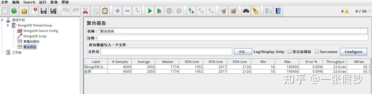 还是选中 MongoDB Thread Group,点右键,在右键菜单选择菜单项:添加 -> 监听器 -> 察看结果树 和 聚合报告。