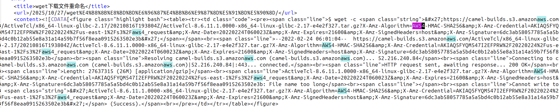 使用关键字 AWS 查找 search.xml 发现是因为一篇博文中粘贴的一个下载地址中包含了密钥信息导致的。如下图: